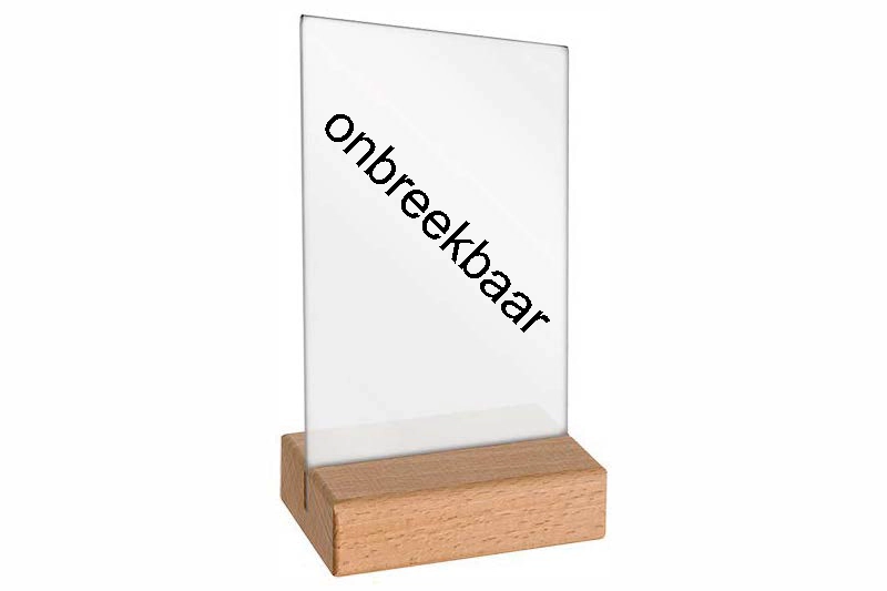Losse onbreekbare kaarthouder A6 van PETG voor houten voet – hoogte170 mm